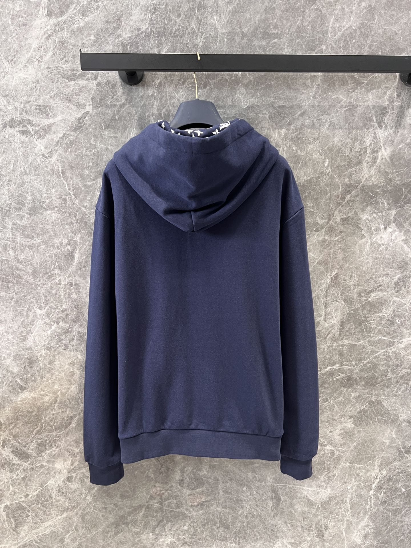 這款休閒的連帽上衣以精緻的深藍調呈現,連帽內和絲帶造型抽繩飾以清新的白色Monogram印花圖案。金色的孔眼與抽繩末端為設計增添時尚格調。上衣以純有機棉製成,適合旅行穿著,也是百搭的日常休閒之選
